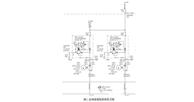 拉伸墊泵站由控制油泵、高壓油泵、低壓油泵、循環(huán)冷卻泵組成。實際工作中,除開其它原因?qū)е碌谋脝訔l件不滿足的情況外,系統(tǒng)壓力故障主要有兩種情況,液壓泵損壞和泵出口控制閥損壞。液壓泵或電機損壞直接導(dǎo)致系統(tǒng)無壓力,這種故障查找也非常簡單:啟動液壓泵檢查電機和泵的運行狀態(tài),如果運行正常,泵體和進出油管溫度與油箱溫度接近,說明泵沒有問題;如泵不能啟動,即可排查電機控制電路的熔斷器,如熔斷器正常,即可檢查電機繞組;若出現(xiàn)液壓泵能夠啟動但超負載的現(xiàn)象,需要拆分電機和泵的連接,分別盤車,排查故障是電機還是泵的原因造成。液壓拉伸墊泵站采用先導(dǎo)式溢流閥、換向閥和單向閥的組合,實現(xiàn)系統(tǒng)供油和泵無壓循環(huán)功能,如圖 1 所示:拉伸墊動作時系統(tǒng)壓力開關(guān)監(jiān)控到壓力降低至最小工作壓力,就會給出指令到控制溢流閥的換向閥;換向閥得電斷開先導(dǎo)閥回油,溢流閥停止無壓循環(huán)開始往系統(tǒng)供油;當(dāng)系統(tǒng)壓力達到最大工作壓力后換向閥失電,系統(tǒng)開啟無壓循環(huán),單向閥阻止系統(tǒng)油液回流。由于從供油至無壓循環(huán)交替的過程中,單向閥也會隨開啟關(guān)閉動作,插裝式單向閥關(guān)閉時如果進出口壓差過大,閥芯關(guān)閉就會沖擊閥體,可能導(dǎo)致閥體碎裂,泵出口油路與回油管直通。若拉伸墊設(shè)備在投入使用初期,可能會多次出現(xiàn)單向閥損壞使得系統(tǒng)壓力不能建立故障,這就需要調(diào)低先導(dǎo)式溢流閥的開啟壓力即可解決這個問題。而溢流閥的壓力調(diào)整可以根據(jù)壓力切換時的狀態(tài)來調(diào)整,可先將壓力調(diào)高至單向閥關(guān)閉時到出現(xiàn)嚴重撞擊閥體上限,再略微調(diào)低壓力,直到單向閥柔和關(guān)閉為止。溢流閥壓力調(diào)整太低則會導(dǎo)致系統(tǒng)達不到最高壓力而一直供油,油液一直溢流回油箱的現(xiàn)象。