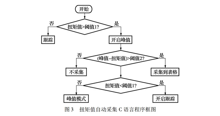 大多數(shù)儀表只具有顯示功能不具有數(shù)據(jù)采集和分析功能,校準(zhǔn)人員在校準(zhǔn)時(shí),一邊操作校準(zhǔn)裝置,一邊用筆記錄校準(zhǔn)數(shù)據(jù)。這樣不但工作效率低還容易出錯(cuò)。為了方便校準(zhǔn)員做記錄,儀表專門設(shè)計(jì)了數(shù)據(jù)采集功能,采集表格形式完全按照 JGJ707—2014《扭矩扳子檢定規(guī)程》的表格形式[7,這樣方便后面的計(jì)算和出證書。儀表采用具有C語(yǔ)言功能的觸摸屏作為顯示終端。校準(zhǔn)人員可以通過設(shè)定最大扭矩值和采集觸發(fā)值, 實(shí)現(xiàn)扭矩值的自動(dòng)采集。并根據(jù)采集數(shù)據(jù)進(jìn)行平均值和示值相對(duì)誤差和示值重復(fù)性的計(jì)算。C 語(yǔ)言程[8]框圖如圖3 所示。其中閾值1表示進(jìn)入峰值模式的判斷條件,閾值2表示采集峰值判斷條件。當(dāng)扭矩值超過閾值 1,儀表自動(dòng)從跟蹤模式變?yōu)榉逯的J。?dāng)峰值和當(dāng)前的扭矩值之差大于閾值 2 時(shí),程序會(huì)將峰值自動(dòng)采集到表格中,然后解除峰值功能。閾值1和2的設(shè)定根據(jù)智能傳感器的量程來(lái)計(jì)算得到。本設(shè)備中閾值1為傳感器滿量程值的5%,閾值2為滿量程值的2/3。