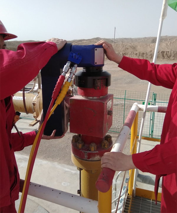 天然氣單井固定式節(jié)流閥專用液壓扭矩扳手施工現(xiàn)場