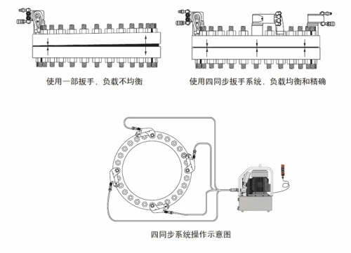 對于較大的扳手,建議用一臺(tái)泵控制兩同步系統(tǒng),或二泵二扳手同時(shí)對邊鎖緊的雙系統(tǒng)。