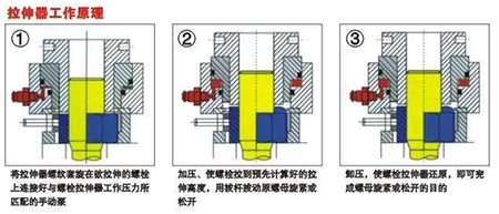 液壓螺栓拉伸器一般由液壓泵、高壓軟管、壓力表和拉伸體組成。其中液壓泵為動力源,壓力表反映泵的輸出壓力,高壓軟管聯(lián)接液壓泵和拉伸體。拉伸體是實現(xiàn)螺栓拉伸的執(zhí)行元件。主要由活塞缸、活塞、支承橋和拉伸螺母組成。結(jié)構(gòu)如下圖所示。工作時,動力源輸出的高壓油經(jīng)高壓軟管輸送至活塞缸3,在壓力作用下活塞缸中的活塞上移,帶動拉伸螺母向上移動。拉伸螺母與工作螺栓螺紋聯(lián)接,從而拉長工作螺栓,使螺栓伸長達(dá)到所要求的變形量,變形控制在彈性變形范圍之內(nèi),然后進(jìn)行預(yù)緊或拆卸作業(yè),最后通過液力或者機械回位的方式使工作螺栓回復(fù)原來的形狀,完成作業(yè)。