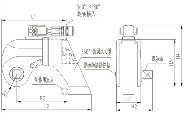 液壓扳手的工作頭主要由三部分組成,框架(也叫殼體),油缸和傳動(dòng)部件。油缸輸出力,油缸活塞桿與傳動(dòng)部分組成運(yùn)動(dòng)副, 油缸中心到傳動(dòng)部件中心這個(gè)距離是液壓扳手放大力臂,油缸出力乘以力臂,就是液壓扳手理論輸出扭矩, 由于摩擦阻力存在, 液壓扳手實(shí)際輸出扭矩要小于理論輸出扭矩。