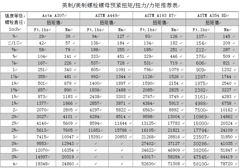 英制/美制螺栓螺母預(yù)緊扭矩/扭力/力矩推薦表