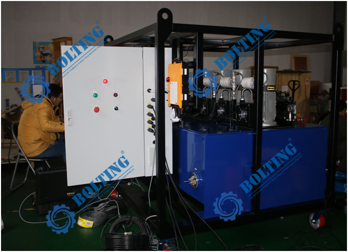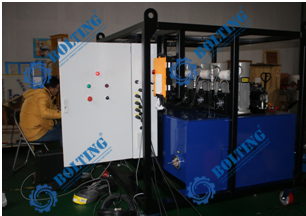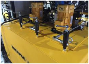 (1) 液壓動(dòng)力單元配置兩臺(tái) 其他品牌 高 效 ZE 系列電動(dòng)泵供油,正常情況下一臺(tái)電動(dòng)泵為兩個(gè)液壓油缸供油; (2) 同時(shí)可以通過(guò)外部管路連接后用其中一臺(tái)電動(dòng)泵為四個(gè)液壓油缸供油; (3) 高頻電磁換向閥用于頂升/縮回控制; (4) 一個(gè) 800L 可用液壓油容量的油箱為系統(tǒng)的應(yīng)用和循環(huán)冷卻提供充足的油量; (5) 配置液壓油冷卻器可以及時(shí)冷卻液壓油,防止工作過(guò)程中液壓油溫度上升過(guò)快; |