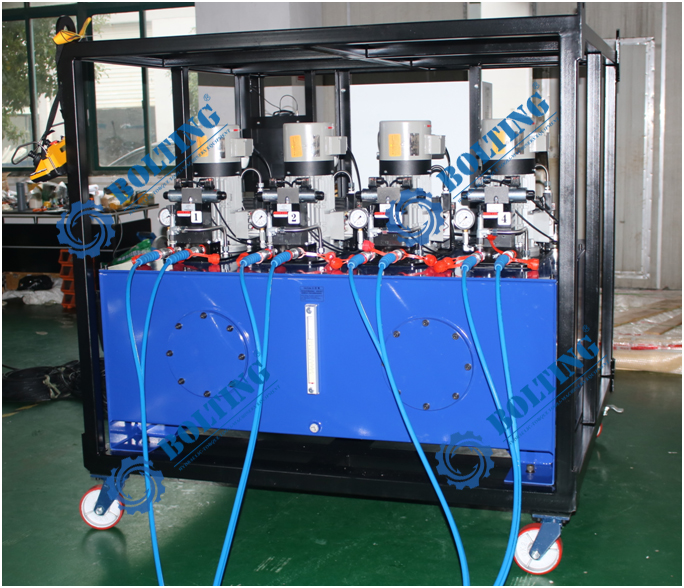 BOLTING博霆1600噸PLC控制全自動(dòng)同步頂升系統(tǒng)(數(shù)控智能油缸同步控制系統(tǒng))實(shí)驗(yàn)中
